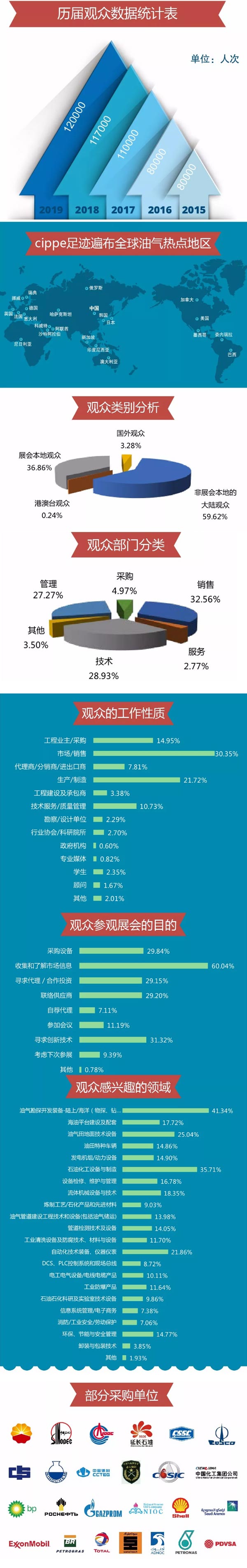 2020年,中石油、中石化、中海油总部参观团,中石油物资公司、中石油勘探开发海外项目部、中国石油天然气管道局、中石油海洋工程公司钻井事业部、中石油渤海钻探工程有限公司、中石化石油工程物资装备部、中海油服采办中心、中海油服油田技术事业部、大庆油田、辽河油田、胜利油田、大港油田、华北油田、延长石油、中外运长航集团、中远船务、中船重工、中国船舶工业集团、国家能源液化天然气技术研发中心、海隆油服、惠生工程、伊拉克石油部代表团、蒙古国矿产石油局、Busan Marine Equipment Association、沙特阿美、阿布扎比国家石油公司、阿布扎比国家能源公司、阿布扎比国家石油建设公司、爱沙尼亚国家能源公司、俄气、俄油、俄管道、马来西亚国家石油、哈萨克斯坦国家天然气运输公司、阿塞拜疆国家石油、日本钻井公司、壳牌、道达尔、康菲、福陆工程、现代重工、德希尼布FMC、英国派特法石油工程公司、挪威船级社、三星重工、Oceaneering、Sembcorp Marine、Global Marine Services等百余个国内外专业采购团将继续到cippe展会现场参观。