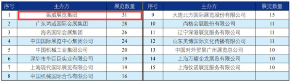 《中国展览经济发展报告(2018)》显示,2018年共有15家国内组展企业办展数量超过10个,有9家内地组展企业办展数量超过15个。其中,振威展览集团共举办 31 个展览,办展数量在国内组展企业中位居首位。