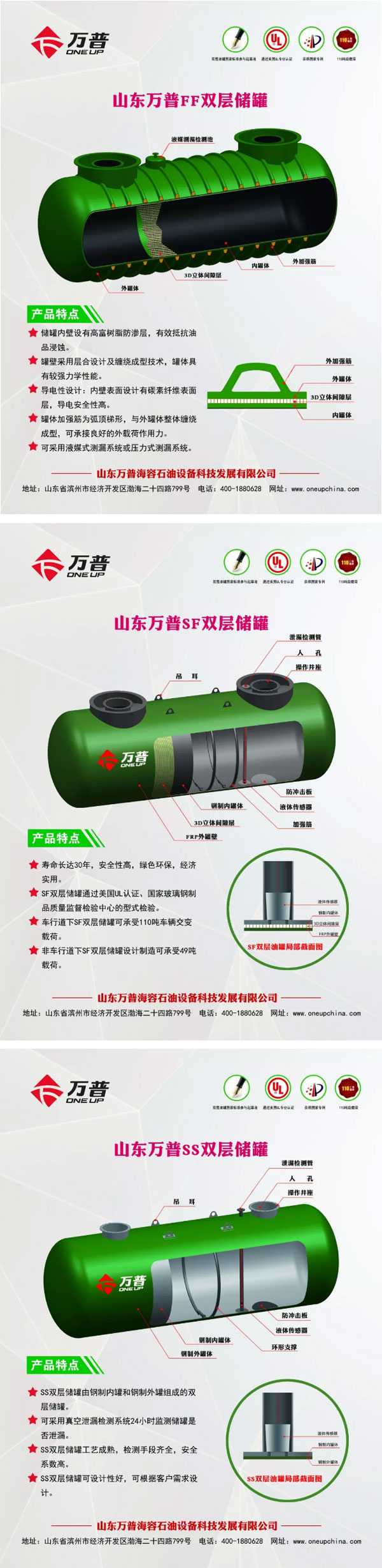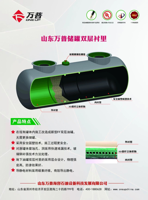山东万普海容石油设备科技发展有限公司(简称万普公司)成立于2011年10月,是集生产、研发、销售、培训于一体的石油化工装备高新技术企业。万普公司主要生产双层储罐,加油站埋地储罐内衬防渗改造工程,撬装式加油装置,D1、D2类压力容器等产品,年生产能力6000余台。先后通过美国UL认证、中石化安工院检验、国家玻璃钢制品质量监督检验中心型式试验。