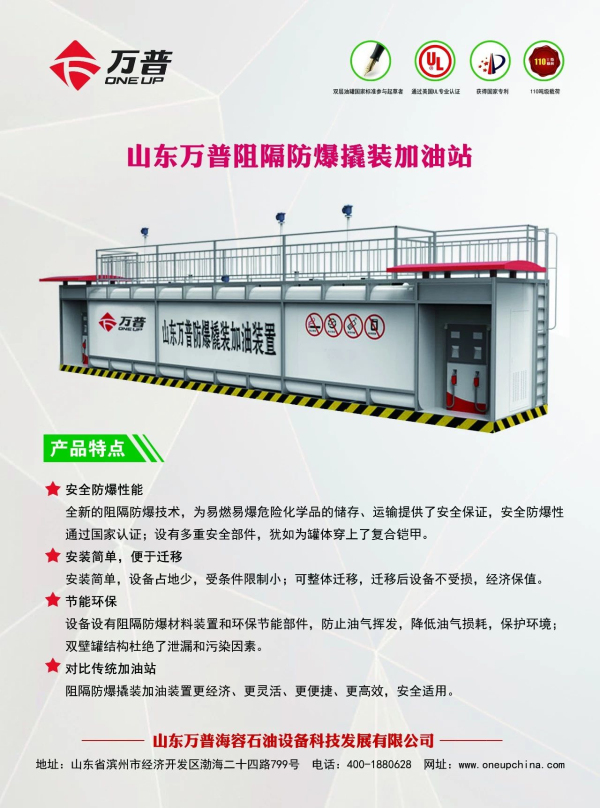 撬装式加油装置是集储油罐、加油机、视频监控为一体的地面可移动加油站;采用阻隔防爆技术改造,将阻隔防爆材料按一定的密度方式填充在储存有易燃、易爆液体的储油罐中,当遇到明火、静电、撞击、雷击、枪击、焊接、意外猛烈撞击事故时都不会发生爆炸事故。具有防火防爆,安全环保,占地面积小,便于迁移等特点,产品广泛适用于公交站点、港口、码头、机场、大型施工场地、企业内部加油站等。