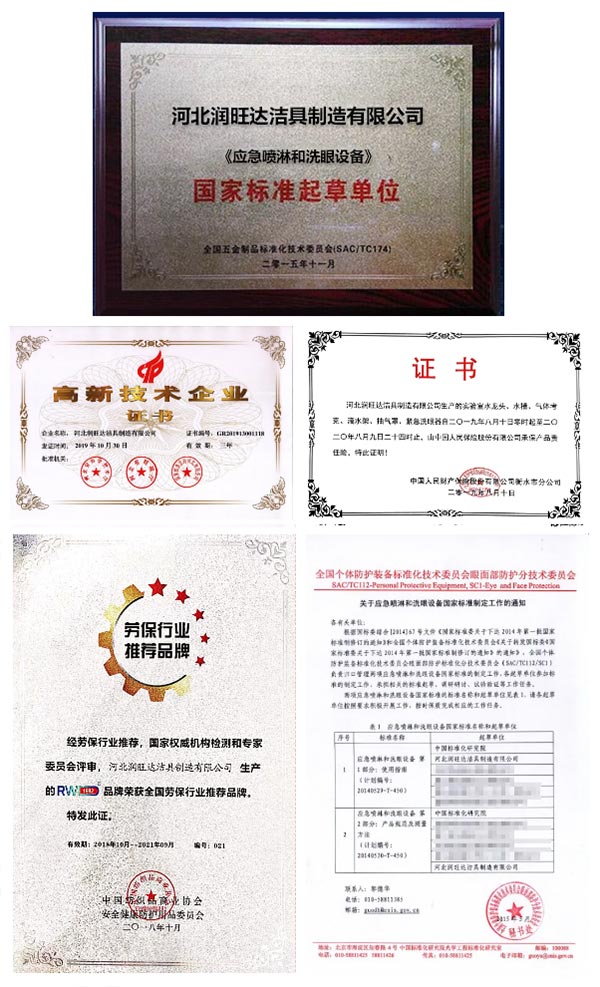 经过多年发展,润旺达公司斥资建立了同行业少有的产品检测中心,拥有光谱分析仪、盐雾测试机、寿命测试机、水压密封测试机、气密测试机、强度测试机、流量测试机等多台先进检测设备,构建高效的企业研发和产品检测体系,参与起草制定了《GB/T38144.2-2019应急喷淋和洗眼设备》国家标准,并以先进的研发体系,申请获得了多项洗眼器专利证书,满足并超越洗眼器行业需求。