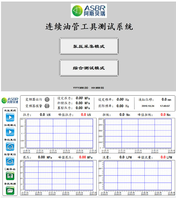 连续油管工具测试系统,其操控方式模拟连续油管主操控制系统,具有泵压采集模式和综合测试模式。根据不同的工具和不同的连续油管工艺,可输入不同的排量和拉力,输出泵压、扭矩、位移、ROP、时间等参数。