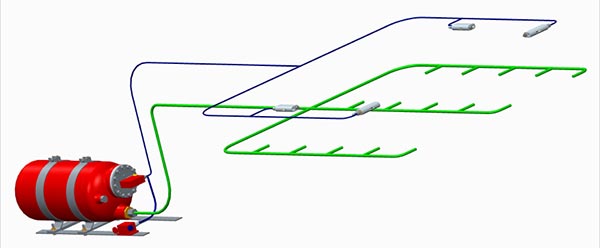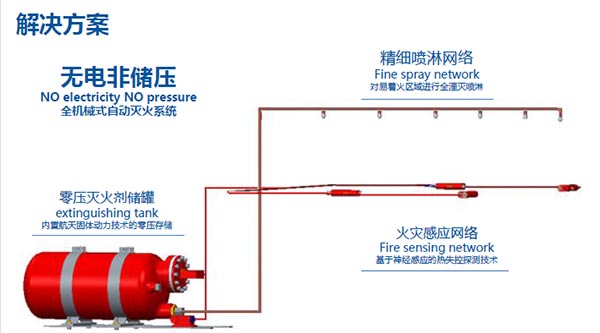 系统由罐体装置 、手动触发器 、感温探火管路 、药剂喷洒管路 、高压雾化喷头 、火源自动探测器、信号反馈装置 及部分接头附件组成。无火情时,系统完全处于零压状态,包括药剂罐内灭火药剂也以无压液体形式存在。火情发生后,在火源自动探测器感温原件被触发,迅速产生高压气体传导至罐体并触发产气组件内固体产气剂反应产生大量高压气体,高压气体推动灌内药剂,将其通过管路和喷头喷洒出去,迅速湮没受保护的空间,覆盖、降温并隔绝空气,实时火情抑制,扑灭火情。