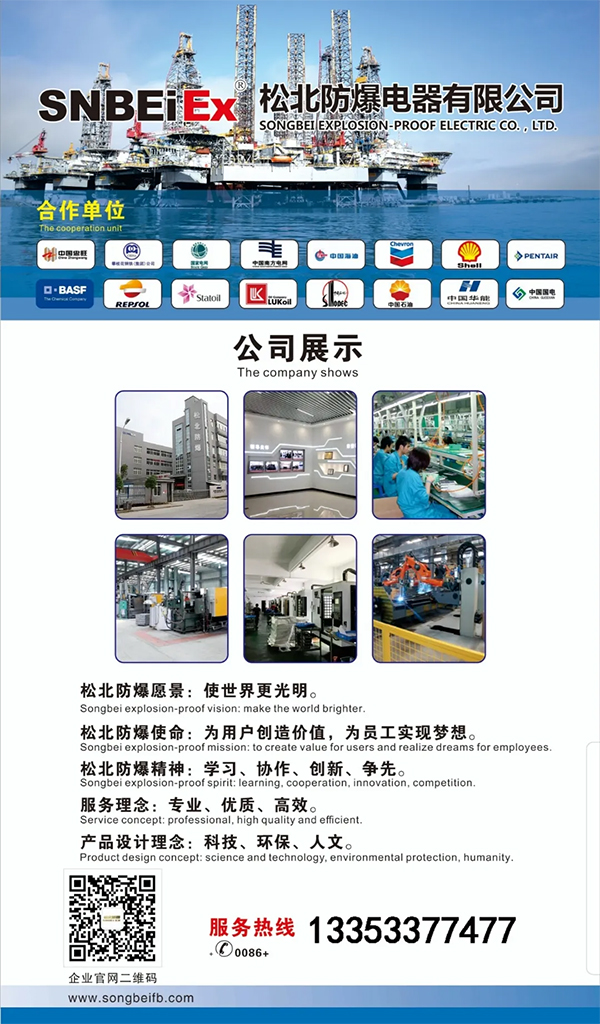 松北防爆电器有限公司是一家及研发、制造、销售一条龙的专业性企业。公司产品广泛应用于石油、化工、天然气、煤炭、 航空航天、船舶、海洋、军工、消防、电力、铁路、冶金等行业,国内畅销31个省市和10多个国家和地区,深受广大用户好评和赞美 。公司主要生产:防爆灯、防爆配电箱、防爆操作柱、防爆控制箱、防爆磁力启动器、防爆开关(断路器)、防爆插销、防爆按钮、 防爆软管、防爆填料函、防爆电缆盘、防爆接线盒及管件、防爆其它类、防爆配件等100多种产品。