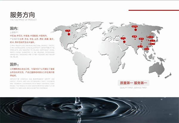 公司自1999 年成立至今,本着“用户至上,质量至上,技术至上,服务至上”的经营理念,凭借多年的积累和打 拼,在石油行业内拥有良好的口碑和众多客户,生产的产品不仅覆盖西安、北京、山东、杭州、深圳、重庆、新疆等国内市场,更远 销俄罗斯、中东、北美等海外市场。