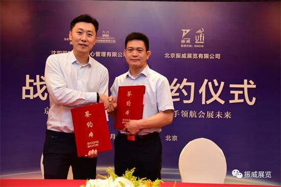 沈阳国展工会主席张楠、副总经理李成光、经营管理办公室主任赵春翔、党群人资办公室副主任刘壮、党群人资办公室副主任李倩;振威展览股份副总裁陈旭、副总裁兼北京振威总经理贾鹏洲、北京振威副总经理丁颖、总裁办副主任德巍、运营部经理孙喆等领导出席签约仪式。