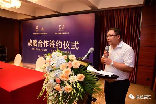 2018年7月10日下午,沈阳国际展览中心与北京振威展览有限公司在北京中奥马哥孛罗酒店举行战略合作签约仪式。沈阳国展总裁刘雨声、振威展览股份董事长张学山出席签约仪式并讲话,振威展览股份常务副总裁邓小辉主持仪式。