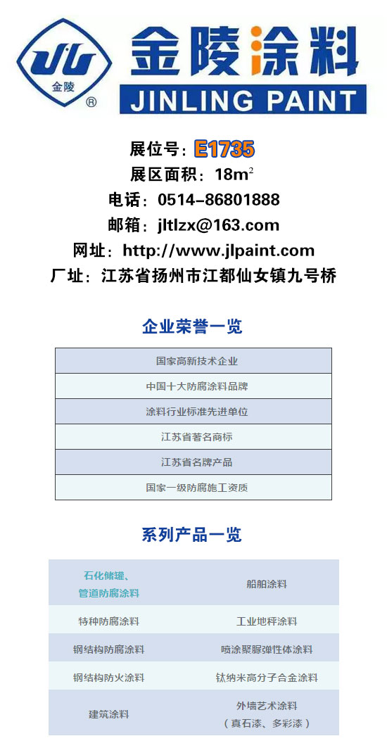 江苏金陵特种涂料有限公司将出席第十届上海石油化工装备展(cippe)。江苏金陵特种涂料有限公司是我国最早生产特种涂料的公司之一,荣获“国家高新技术企业”“中国十大防腐涂料品牌”。他们将带来石化储罐、管道防腐涂料等一些列特种涂料产品。其展位号E1735,欢迎企业来访问询、详谈合作。