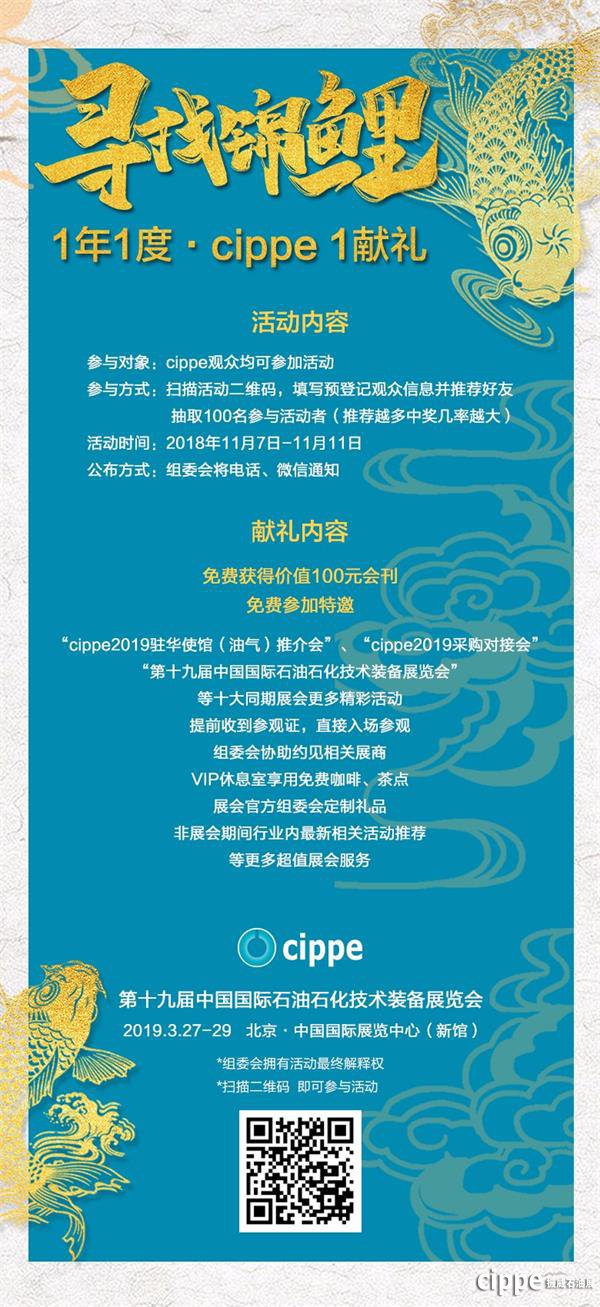 2019年3月27-29日,第十九届中国国际石油石化技术装备展览会(cippe2019)将在北京顺义新国展举行。届时,将有来自全球65个国家和地区的1800家企业参展,国内外石油巨头将齐聚cippe,展会同期专题论坛活动也是精彩纷呈。