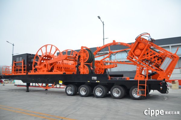 面对客户的高难度需求,杰瑞研发工程师迅速成立项目组,认真研究并解读当地道路运输法规,打破传统研发思路桎梏,大胆创新,用实力为 客户打造定制化产品。该设备配备了杰瑞自主研发的140K注入头与最新型超大滚筒,油管滚筒可缠绕2.625寸连续油管长达7560米,采用重型专用底盘 ,可以承载连续油管高达57吨,全方位满足大排量压裂、连续油管钻井等作业需求。