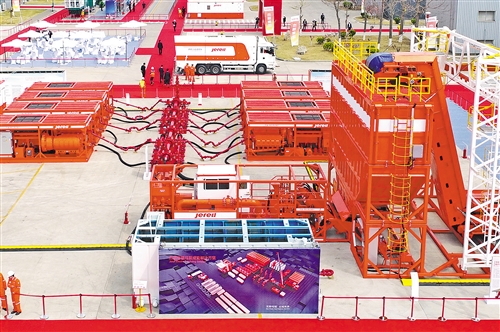 4月20日,全球首个电驱压裂成套装备在山东烟台杰瑞集团亮相。成套装备由电驱压裂设备、电驱混砂设备、电驱混配设备、智能免破袋连续输砂装置等组成,能够让页岩气实现低成本、高效率、智能化开发,加速页岩气开发进程。唐 克摄