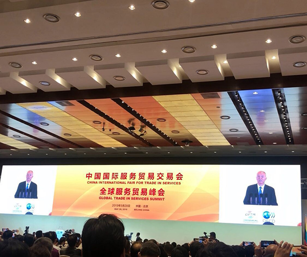 2019年5月28日-6月1日,中国国际服务贸易交易会在京盛大开幕。28日上午,全球服务贸易峰会在北京国家会议中心召开。2019年中国国际服务贸易交易会受到国家主席习近平的高度重视,专程发来贺信并指出:中国愿同各国深化服务贸易投资合作,促进贸易和投资自由化、便利化,推动经济全球化朝着更加开放、包容、普惠、平衡、共赢的方向发展。